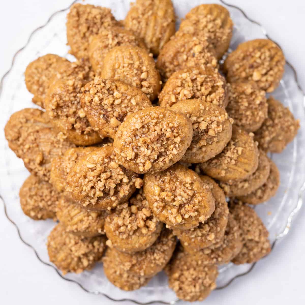 Oval shaped classic Greek cookies dipped in honey, and topped with crushed walnuts.